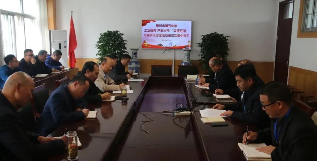 3月30日上午,市第五中学在会议室开展工业强市、产业兴市“攻坚五问”大调研大讨论活动第三次集中学习,全体领导干部参加,会议由党总支书记刘汝仲同志主持。