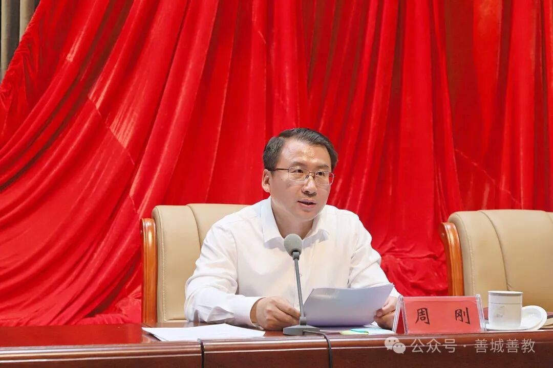 周刚在主持时强调,要聚焦立德树人根本任务,切实做到以文化人、以德育人。全市上下特别是广大教育工作者要坚持把立德树人作为教育工作的主线,把素质教育作为教育的核心,全面推动“五育”融合、同向发力,努力构建德智体美劳全面培养、全面过硬的教育体系。要紧扣人民满意重要标尺,切实做到科学办学、强师兴学。各有关部门要锚定办好人民满意的教育这一目标,持续深化教育综合改革,深入实施集团化办学,推动形成系统完备、科学规范的体制机制,争当全省县域教育新典范;广大教师和教育工作者要自觉践行教育家精神,不断提升学科能力和学科素养,更好地肩负起教书育人的神圣使命。要发扬尊师重教优良传统,切实做到凝聚合力、精准发力。各级各部门要把教育摆在优先发展的战略地位,勤进学校的门、常问教育的事、善解学校的难,进一步优化教育发展环境;社会各界、各行各业都要热心支持教育、多方关心教育,多为教育办实事、为教师办好事,真正让教师成为最受社会尊重的职业。